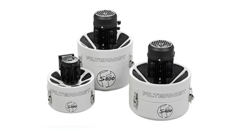 The S 200/S 400/S 800 oil mist separators, fitted with filter-ΓΈ of 260 β 325 mm and just 302 β 453 mm high, are ideal for use in tight spaces on top of or next to a machine tool. The highly efficient motors are characterized by low energy consumption.